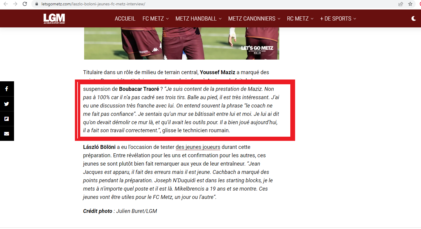 « En effet, sur twitter, un ancien du centre qui l’a connu jeune en défense (habile la formule), est venu me raconter qu’il avait été missionné et embarqué par Boloni lui-même pour aller acheter avec lui au Auchan des gâteaux et des bonbons pour l’anniversaire d’un autre joueur. C’était lunaire. Mais il en a gardé le souvenir d’un être humain touchant avec qui on pouvait discuter. Du coup, lorsque j’ai lu cet article de Letsgometz, évoquant cette discussion entre Maziz et Boloni… Eh bien, elle m’a tout de suite paru plausible et en adéquation le bonhomme :