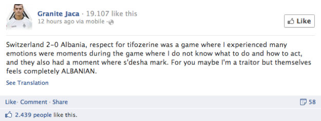 Par la suite, il s’exprime dans un anglais quasi-irréprochable… sur son compte Facebook, confirmant qu’il a bien fait exprès de manquer de respect footballistique envers les Albanais parce qu’il aime trop l’Albanie…et se sent « complètement Albanais ». Il se sentait aussi complètement albanais en serrant le poing très fort sur l’ouverture du score…